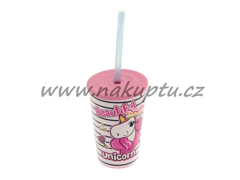 Dětská plastový kelímek s obrázkem v nabídce ve třech barvách. Jedná se o tvrdý plast vhodný na opakované použití. Opatřen víčkem se slámkou.