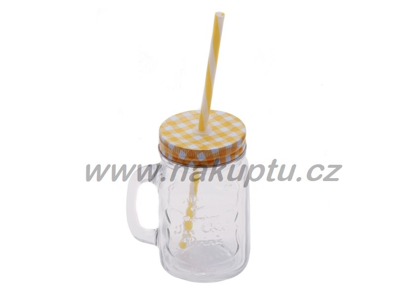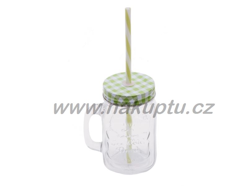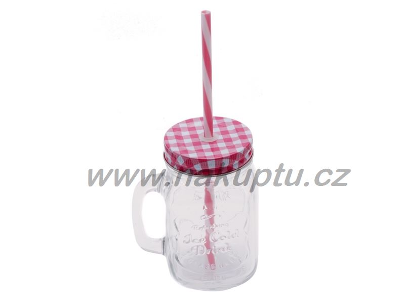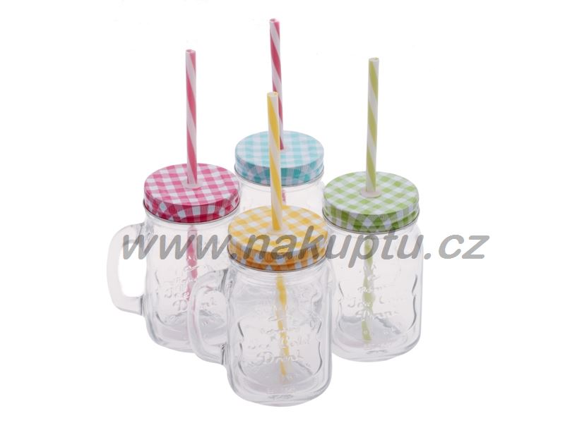 Hrnek/dóza se slámkou na pití. Víko lze snadno zašroubovat či odšroubovat, ve víku je díra na slámku která je součástí balení.