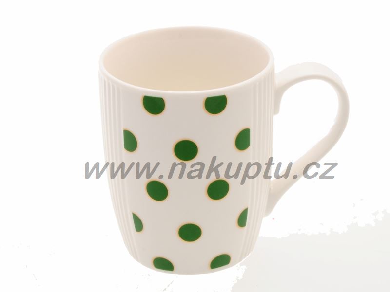 Bílý keramický hrneček s puntíky na přední straně a plast. rytím po obvodu.