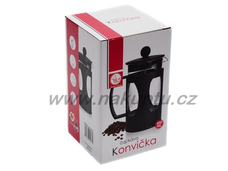 Konvice na kávu, čaj vybavena filtračním pístem. Lze snadno rozebrat. Jednoduše nasypete mletou kávu, nebo například sypký čaj do skleněné nádoby, zaděláte píst (nerez. sítko), necháte louhovat a poté již jen naléváte. Po použití lze snadno vyndat sítko a nádobu umýt.