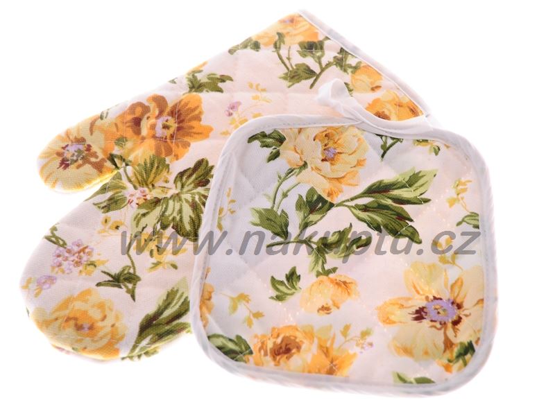 Praktický pomocník, který nechybí v žádné domácnosti. Set chňapek odolných proti teplu vhodné na uchycení horkých hrnců, talířů, plechů apod. Set obsahuje 2 ks, klasickou chňapku a čtvercovou chňapku, kterou lze použít také jako podložku pod horké nádobí. Nabízena u nás v šesti barevných variantách – květiny, proužky aj. (na stránce hledejte pod číslem 2096746).