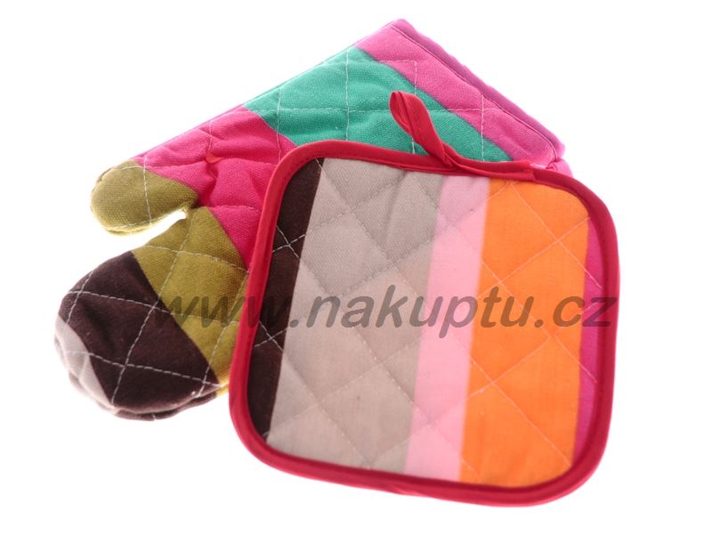 Praktický pomocník, který nechybí v žádné domácnosti. Set chňapek odolných proti teplu vhodné na uchycení horkých hrnců, talířů, plechů apod. Set obsahuje 2 ks, klasickou chňapku a čtvercovou chňapku, kterou lze použít také jako podložku pod horké nádobí. Nabízena u nás v šesti barevných variantách – květiny, proužky aj. (na stránce hledejte pod číslem 2096746).