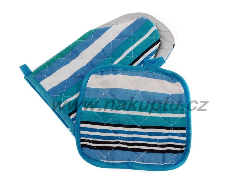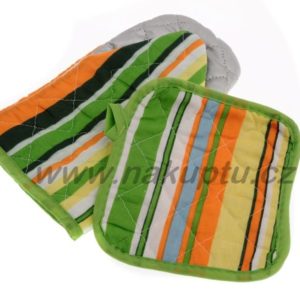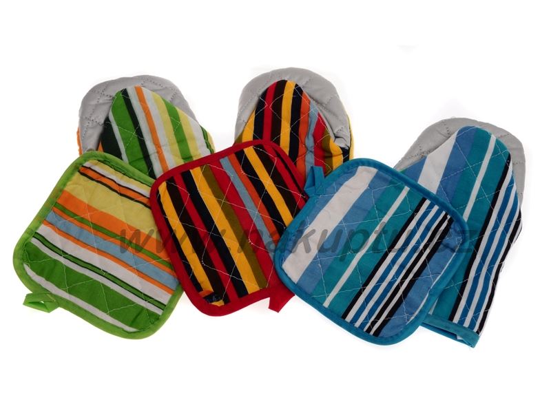 Praktický pomocník, který nechybí v žádné domácnosti. Set chňapek odolných proti teplu vhodné na uchycení horkých hrnců, talířů, plechů apod. Set obsahuje 2 ks, klasickou chňapku s palcem na vnitřní straně a čtvercovou chňapku, kterou lze použít také jako podložku pod horké nádobí. Nabízena u nás ve třech barevných variantách -proužky s modrou, zelenou a červenou (na stránce hledejte pod číslem 2097179).