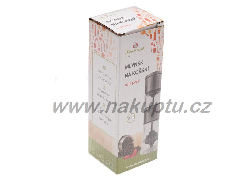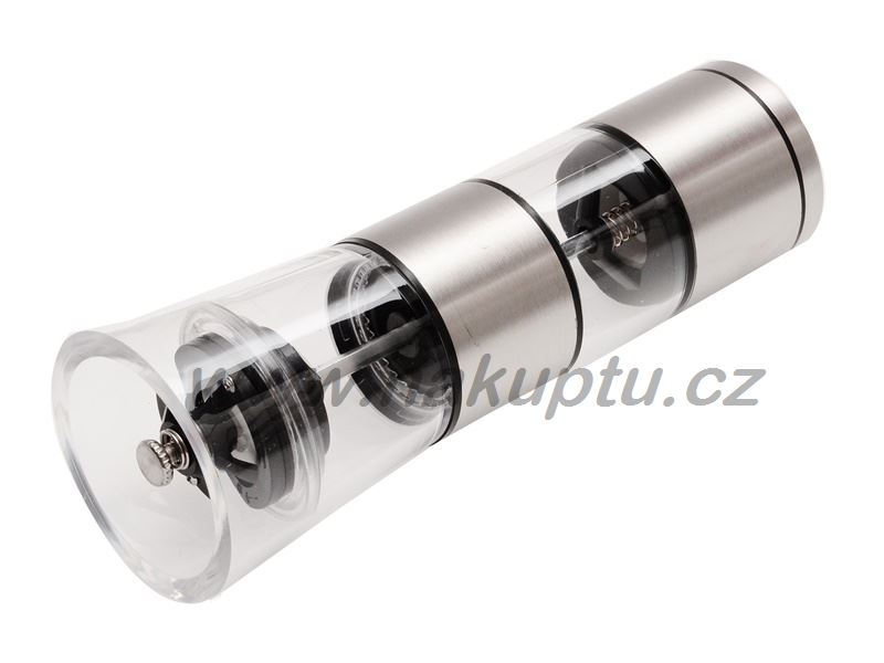 Mlýnek na koření oboustranný opatřený keramickým mlecím mechanismem. Lze nastavit hrubost mletí. Mlýnek můžete použít na dva druhy koření najednou (např. pepř a sůl). Spodní část mlýnku mírně rozšířena.
