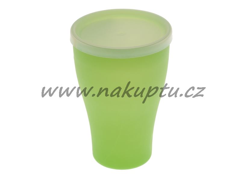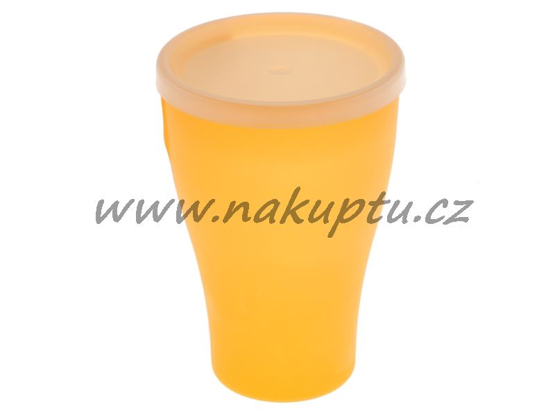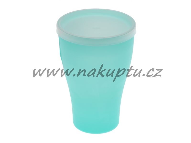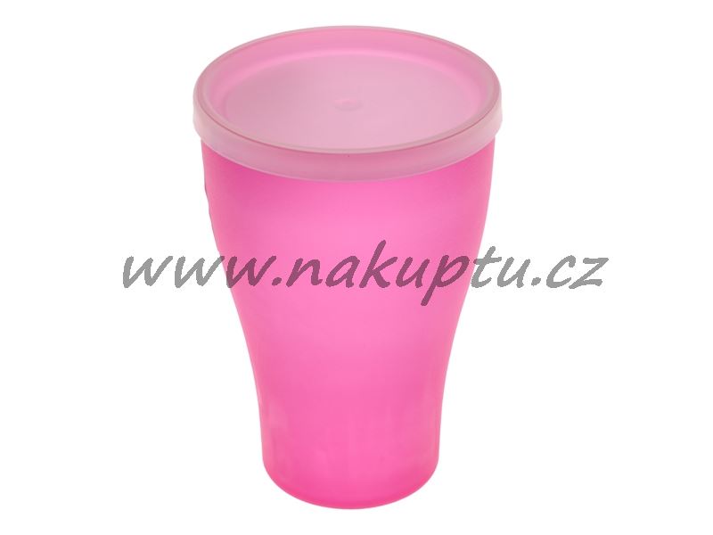 Plastový barevný kelímek, který lze lehce přikrýt víčkem a tudíž se nápoj nevylije, ani do něj případně nenaletí hmyz či nenapadají jiné nečistoty.