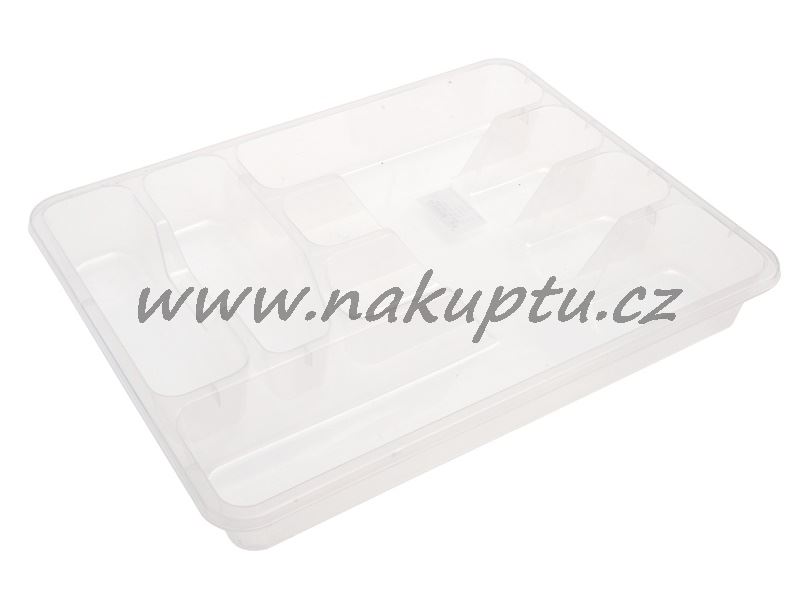 Pořadač na příbory (příborník) pro praktické uskladnění příborů v kuchyňské lince (šuplíku apod.). Zvlášť dvě menší přihrádky na malé lžičky, tři stejné oddíly na příbory a jeden větší na vařečky aj.