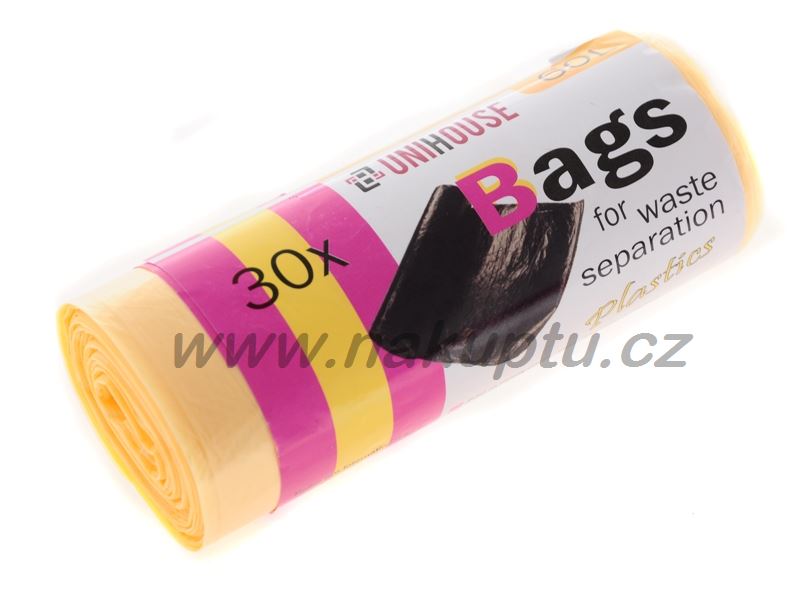 Každodenní potřeba domácnosti – jednorázové odpadkové pytle (sáčky na odpad) ve žluté barvě (vhodné na plastový odpad).