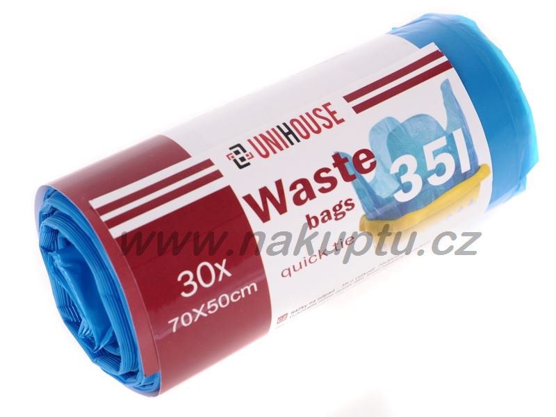 Každodenní potřeba domácnosti – jednorázové pevné zavazovací odpadkové pytle (sáčky na odpad) v modré barvě.