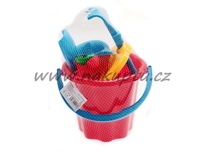 Sada obsahuje kyblík mix barev (výška 19,5 cm, průměr dna 14,5 cm), sítko, lopatku a hrábky a formičku želvy (cca 15 cm), mořského koníka (cca 15 cm) a delfína (cca 15 cm) – mix barev. Hrábky a lopatka uchyceny v otvorech v sítku.